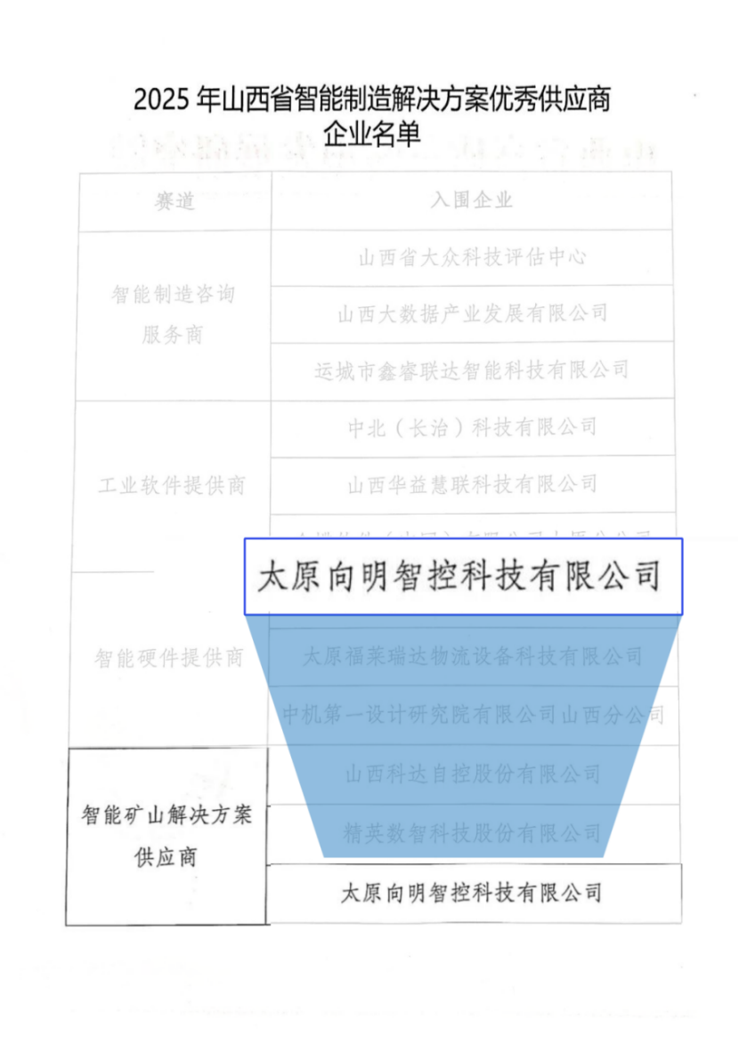 近日,由山西省工业和信息化厅指导、智能制造系统解决方案供应商联盟山西分盟组织、山西省高质量转型发展研究院评审的“2025年第三届山西省智能制造解决方案优秀供应商”评选结果正式揭晓。经过严格筛选与多维度专家评审,向明智控凭借在智能制造领域的深厚积累与卓越服务能力,成功入选“2025年山西省智能制造优秀供应商”。
