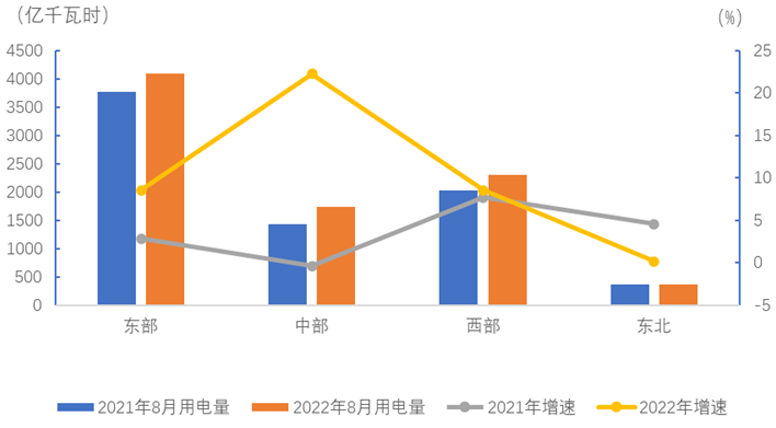 8月份,东、中、西部和东北地区全社会用电量增速分别为8.6%、22.3%、8.6%和0.2%。