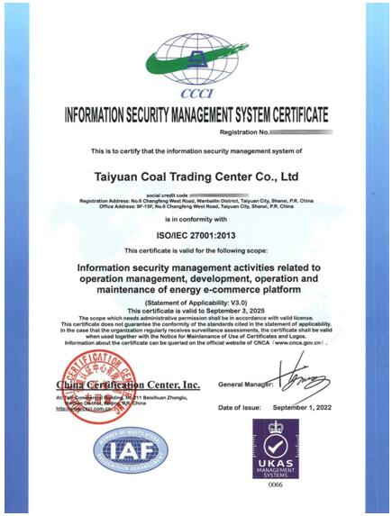 日前,太原煤炭交易中心有限公司(以下简称“交易中心”)通过了信息安全管理体系认证权威机构——华夏认证中心有限公司的监督审核,取得了由CNCA(中国国家认证认可监督管理委员会)和UKAS(英国皇家认可委员会)共同颁布的2022年度ISO/IEC 27001:2013信息安全管理体系认证证书。这是交易中心连续十年通过ISO27001认证,标志着信息安全管理水平再上新台阶!